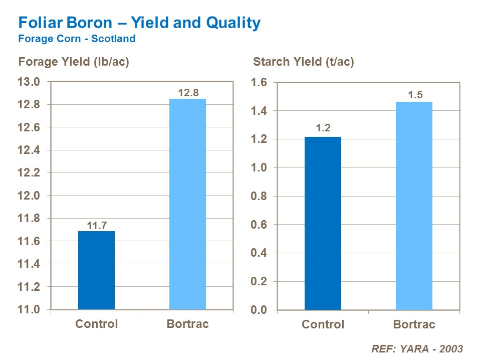 There is evidence that boron increases the yield and starch content of forage corn. Foliar applications made at the V5 or V6 stage, when there is significant leaf cover, will improve yields in deficient crops.