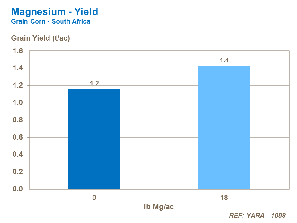 Magnesium is required during peak periods of growth with most intensive uptake starting at around the V5 stage. Uptake continues to maturity and crops need a continuous supply of magnesium to support growth. Where magnesium is in short supply, applications will support better growth and higher yields.