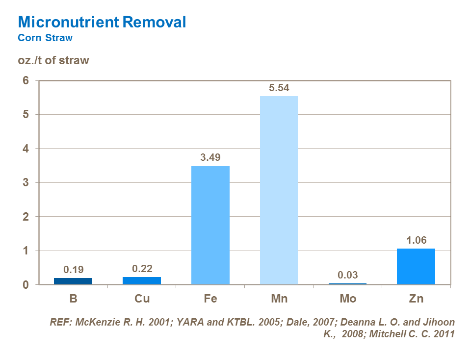 The key micronutrients taken up in greatest quantities are iron and manganese. These two micronutrients are also those which are lost in greatest quantities when the whole crop or straw is removed from the field. However, boron and zinc – which are the two most important micronutrients needed in relatively large quantities – are removed in greater quantities in the grain. It is increasingly common to apply zinc with the seed at planting to ensure good rooting and shoot development.