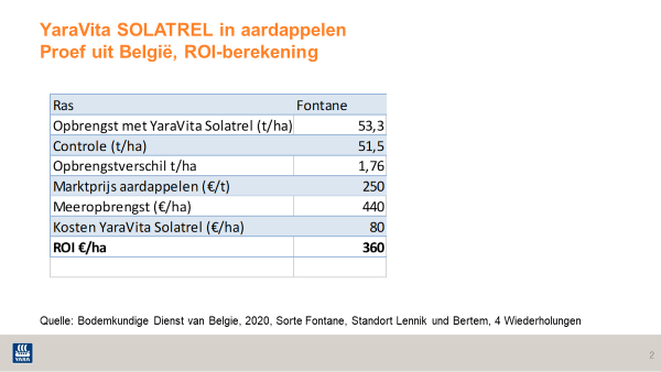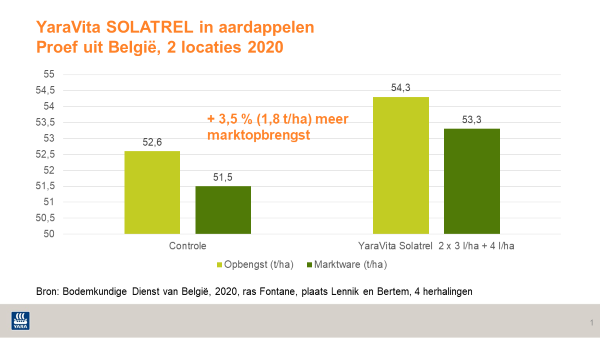 De YaraVita SOLATREL bladmeststof houdt het fosfaatgehalte in het blad constant, zodat de fotosynthese in de plant door blijft gaan. Dit komt ten goede van de plant- en de knollengroei. Uit een recente proef in België is goed te zien dat het opbrengstverschil 1,76 t/ha was, waardoor de kosten voor YaraVita SOLATREL ook eenvoudig terug te verdienen zijn.