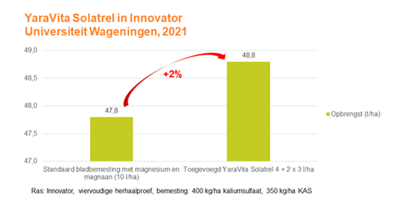 In een recente proef in Lelystad met het ras Innovator resulteerde het gebruik van YaraVita Solatrel (10 liter per hectare) in een verhoogd aantal knollen, vooral in de 60-70 millimeter klasse, die van belang is voor fritesproductie.