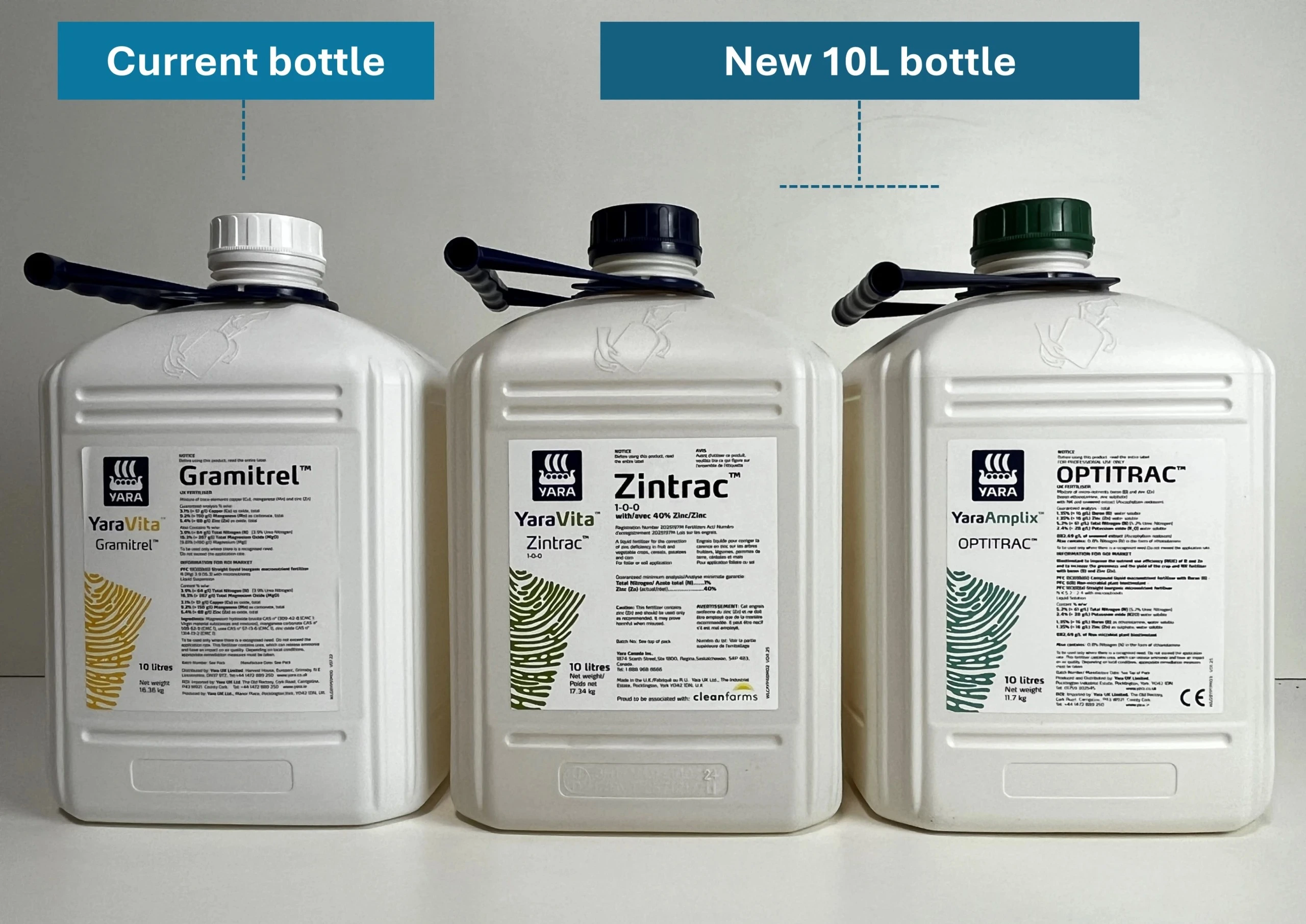 Vanaf november 2025 worden de 10-literverpakkingen voor YaraVita en YaraAmplix geproduceerd met Post-Consumer Recycled (PCR) kunststof. Door 35% gerecycled materiaal toe te passen (met mogelijkheden om dit in de toekomst verder te verhogen naar 50%) wordt zowel de afvalstroom beperkt als de CO₂-uitstoot verlaagd. Per verpakking wordt naar verwachting 0,14 kg CO₂ bespaard.