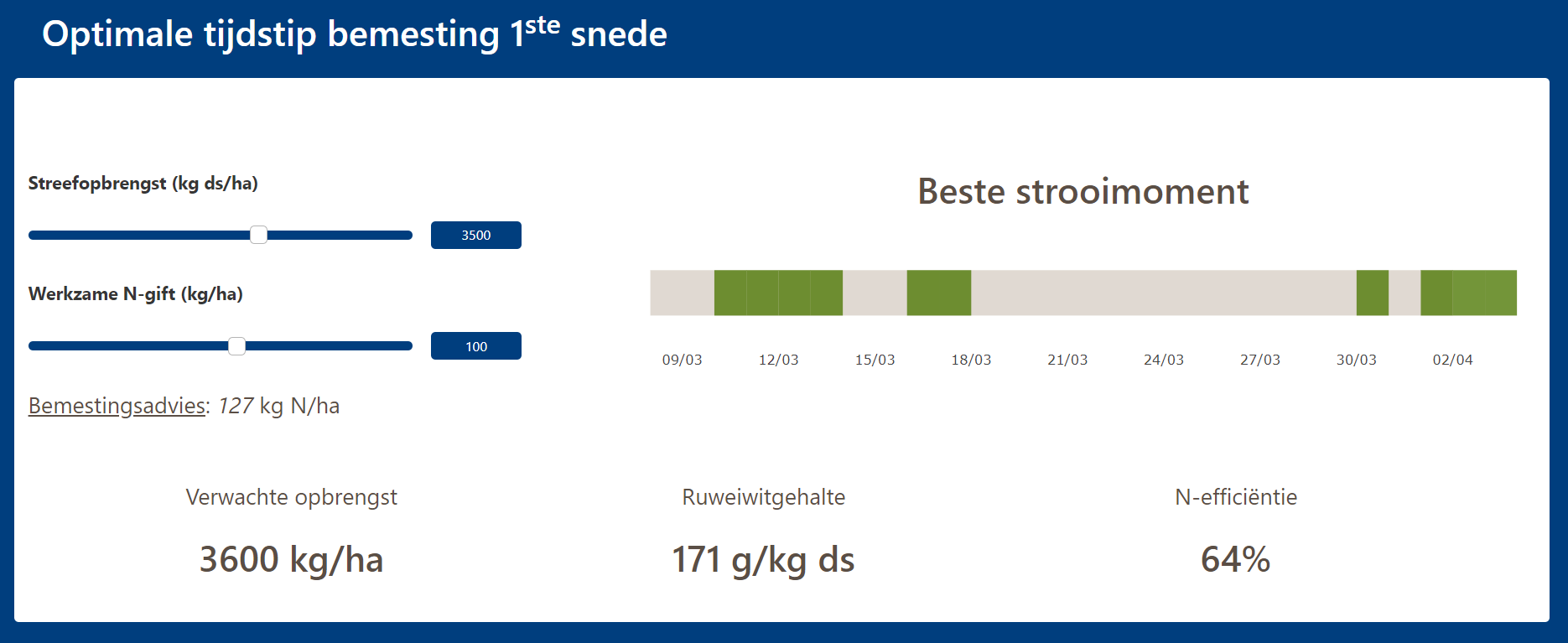 Met de Yara GrassN app 2.0 kunt u kosteloos voor uw eigen bedrijf het optimale strooimoment bepalen. Dit is gebaseerd op uw bedrijfsomstandigheden en uw eigen opbrengst- en kwaliteitsdoelen (RE-gehalte).