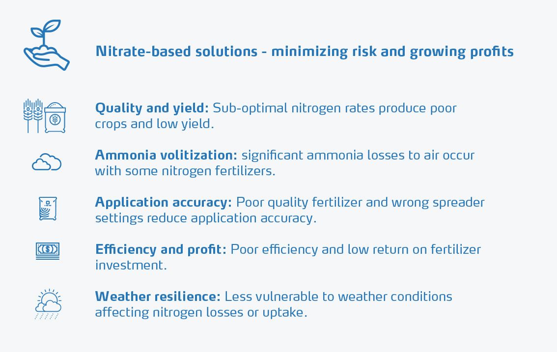 There are five risks that we have prioritized based on our knowledge of farming and work with farmers. To minimize risk and build resilience into a farmers crop production, our nitrate-based solutions have been developed.
